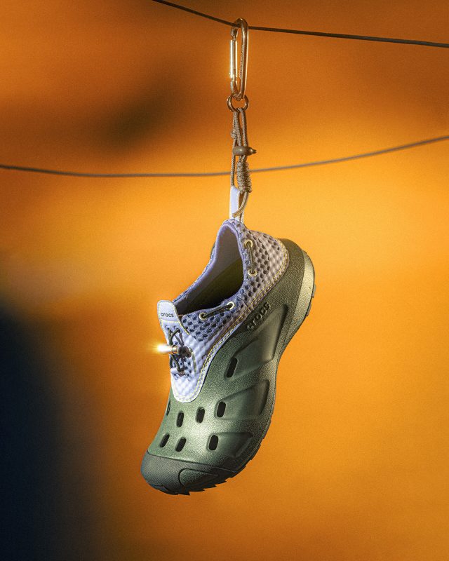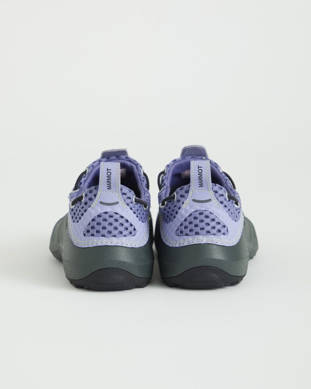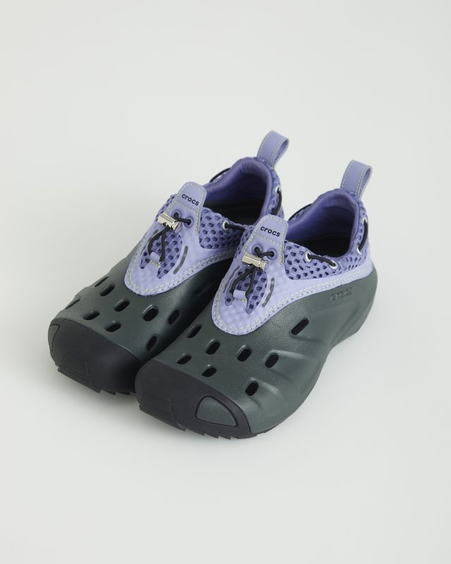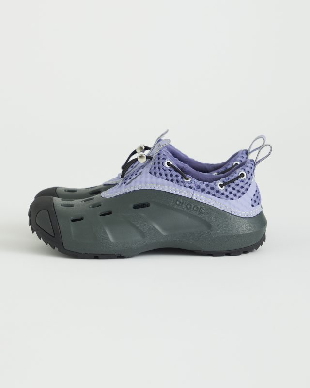 今回新たに登場するのは、アウトドアシーンだけでなくストリートでも着用できるように仕上げたジャパンデザインの新ライン MARMOT とアメリカ発のカジュアルフットウェアブランド Crocs™ がタッグを組み制作したコラボシューズ。2024年より限定店舗のみで展開されている Crocs™ のアーカイブモデル「Quicktrail Low」をベースに作り上げられた。今回は、立体感のあるメッシュ素材のアッパーカバーを採用しているほか、MARMOT を象徴するカラーであるパープルにイエローステッチが施されている。そして、Crocs™ 独自の特製樹脂「クロスライト™︎」を使用したメインアッパーにダークグリーンを取り入れ、アジャスターやアイレットをシルバーにすることで都市から自然の中まで幅広いシーンで活躍する仕上がりに。さらに、様々なアクティビティに持ち運ぶことを可能にするコラボレーション限定のカラビナも付属する。