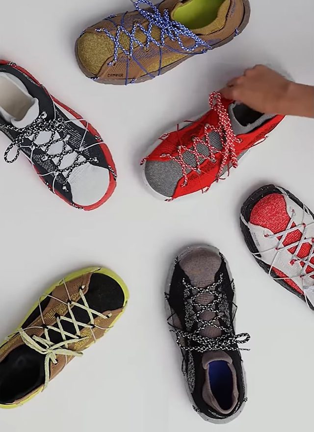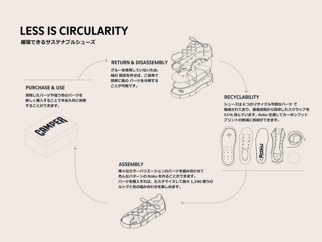 余剰なゴミを出さずに、長く愛用できるシューズ作りに挑戦し続けるブランド CAMPER のサステナブルな精神を最も忠実に実現したライン「ROKU」は、単なる靴ではなく、無限に履くことのできる靴として開発されたシューズ。環境と身体に優しい「ROKU」の人間工学に基づいた設計がされていて、一枚仕立てのニットアッパー、3D ソックス、クッション性のあるフットベッド、シューレース、XL EXTRALIGHT® SUSTAINABLE+ の軽量アウトソールを採用し、素材には製造過程から回収したスクラップや副産物を51%含むなど、サステナビリティとパフォーマンスを両立させたのが特徴だ。また、接着剤を使用しないため、簡単な分解や交換が可能で、寿命が尽きたら再利用できる環境に配慮したラインになる。