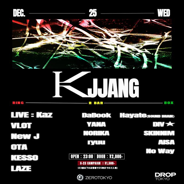 オープン以来、新たなカルチャーの発信地として盛り上がりを見せる ZEROTOKYO が新たに開くのは、スペシャルなニューパーティ「Kjjang」。DJ には、国内問わず幅広いアーティストに楽曲提供を行う DJ・プロデューサーの VLOT が登場。そして KEIJU (ケイジュ) や 3House (スリーハウス) などのライブ DJ を務める New J (ニュージェイ)、さらには OTA (おうた)、KESSO、LAZE (レイズ) といった次世代を担うアーティストが続々ラインナップ。また LIVE ACT では kaz (カズ) が柔らかくメロディアスな歌声で会場を包み込む。