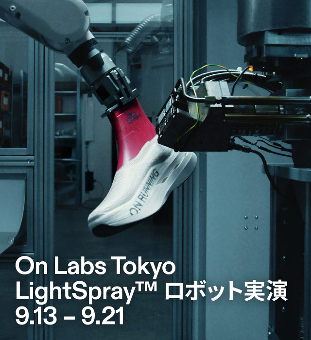 期間限定イベント「On Labs Tokyo」では、アジア太平洋地域では初公開となる最新テクノロジー「LightSpray™」ロボットの実演を実施。日替わりプログラムには、「LightSpray™」技術の舞台裏を紹介する見学ツアーやパネルディスカッション、ダンサー兼振付師の RIEHATA (リエハタ) による限定ワークアウト、3000m障害日本記録保持者の三浦龍司とオセアニア記録保持者 Geordie Beamish (ジョージ・ビーミッシュ) によるトークイベント、さらに書道ワークショップなどがラインナップする。また、最新モデル「Cloudboom Strike LS」を履いてランニング効率を測定できるスポーツラボも設けられ、来場者は五感でブランドの世界観を体感することができる。スポーツウェアの枠を超えた、On の世界観を、ぜひこの機会に体感してみて!