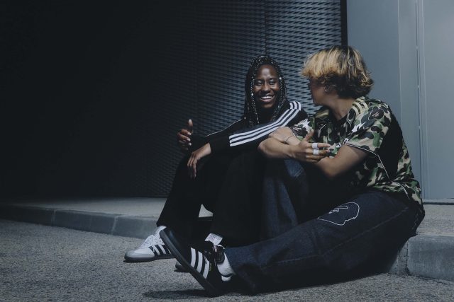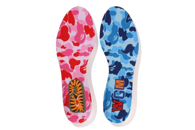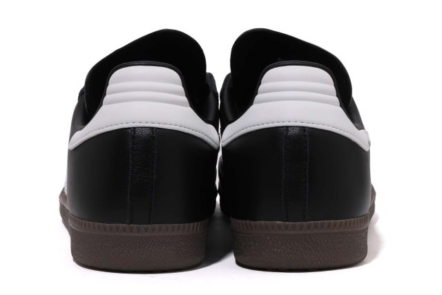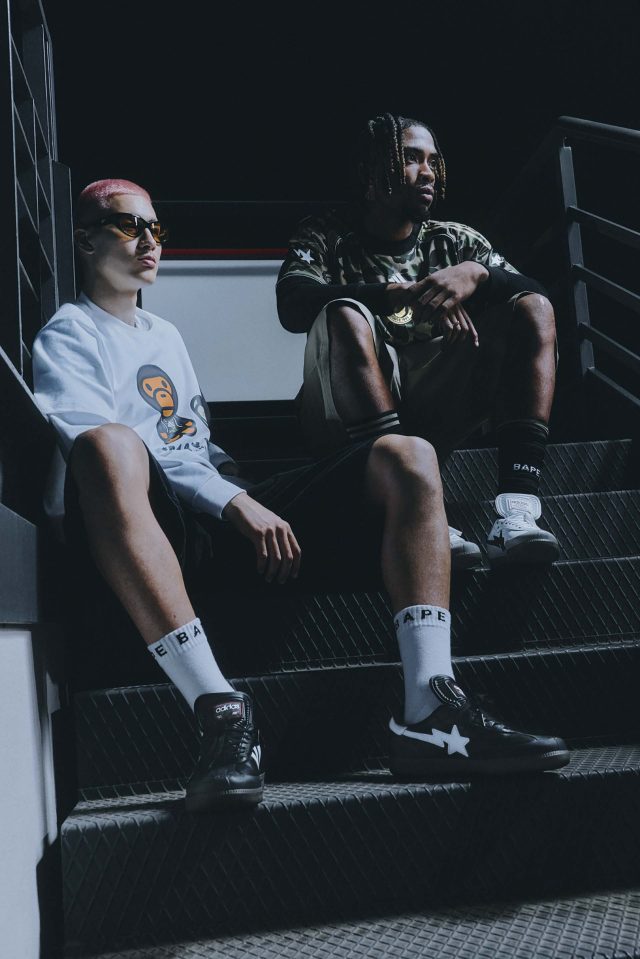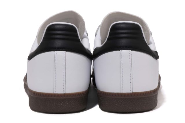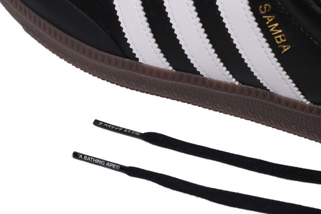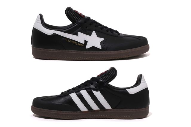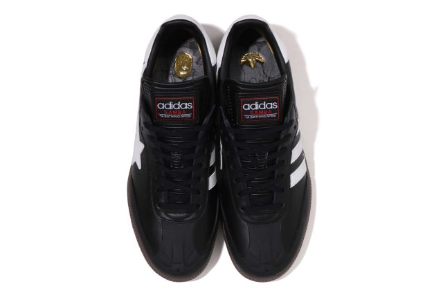 ライフスタイルの文脈では、クラシックな「アディダス オリジナルス サンバ」を BAPE® 流に再構築。レザーアッパーに SKULL STA を施し、左右非対称のロゴ配置やゴールドフォイルのディテールで仕上げた。ホワイトベースとブラックベースの2カラーで登場した。