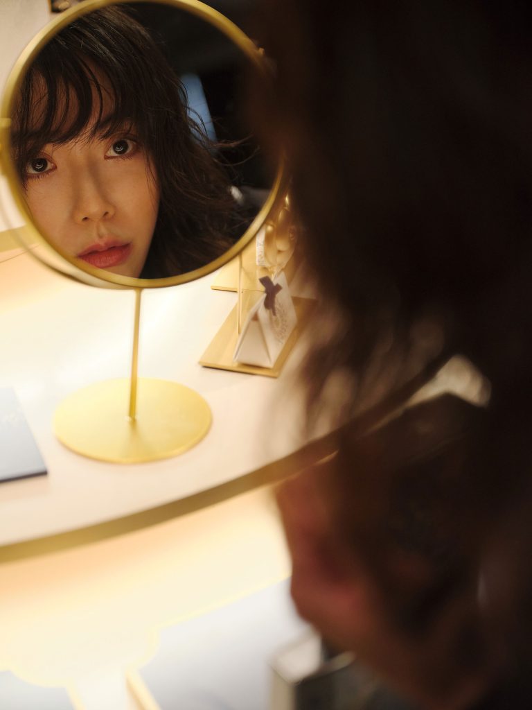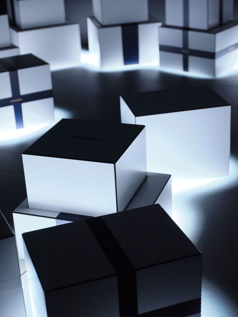 最初にゲストを迎えるのは、シャネルの魔法のシンボルが散りばめられたリボンロード。ライオン、カメリア、麦の穂、パール、コメットの5つが両脇に並び、自身が惹かれるシンボルを選びながら進んでいく。続いて、ギフトボックスが積み上げられたフォトコールエリアを抜けると“星空への旅”へ誘う 4D 体験空間が出現。巨大なギフトボックスに腰掛けると、壁と床面が一体となって動き出し、夜の庭から雲の上、そして星空へ、旅をしているような没入感に身を委ねることができる。最後に登場するのは、中央にギフトショップが佇むフレンチガーデン。ショップにはホリデー限定のコレクションや、シャネルを象徴するフレグランスが並び、大切な人へ、そして自分自身へ贈りたくなるアイテムをセレクトできる空間が用意されていた。