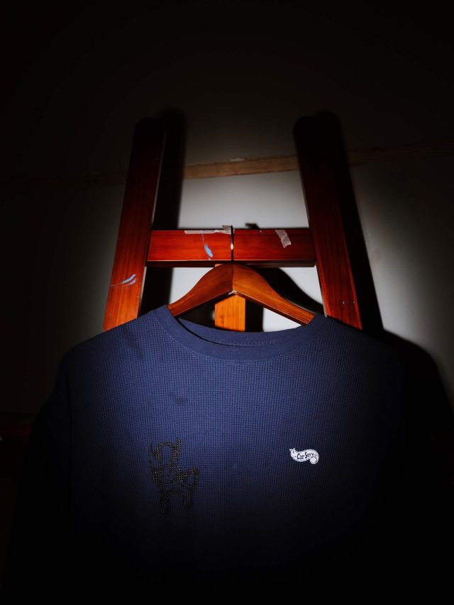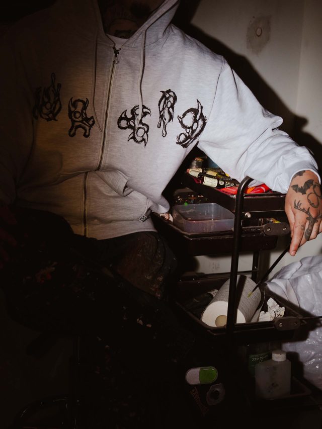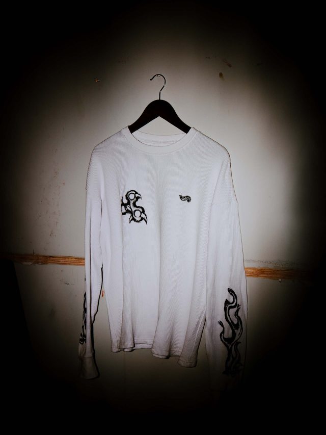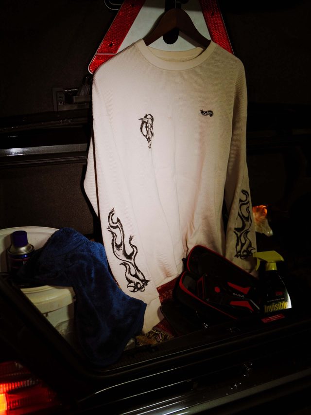 今回のラインナップで注目すべきは、CarService のアイコンである「HW ロゴ」と、RAY の象徴的な「鬼」のモチーフが融合したドリップロゴのジップフーディ。さらに「FRUIT OF THE LOOM (フルーツオブザルーム)」への別注による、鬼のプリントを施したリミテッド仕様のサーマルやバンダナも展開される。これらは RAY の表現するダークかつ力強い世界観を巧みに落とし込んでおり、今までの CarService にはない新たなパターンを提示している。