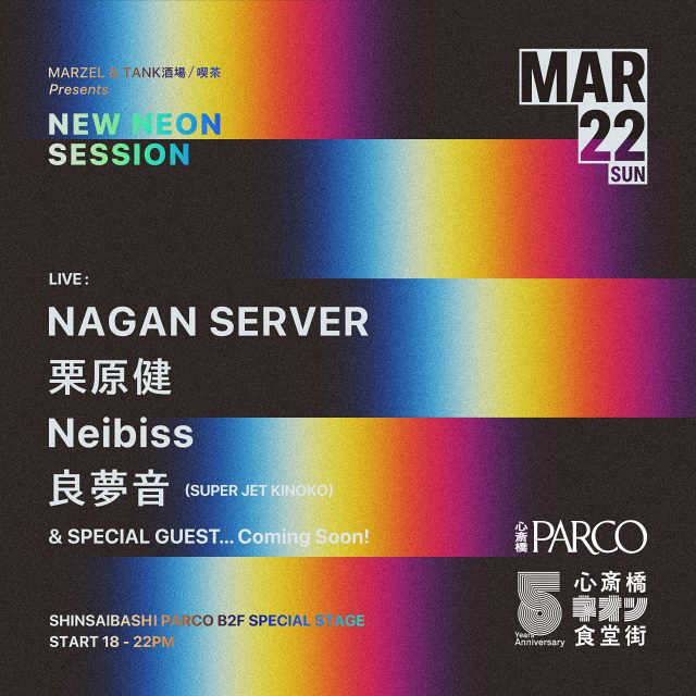 3月20日の夜にはオープニングイベントとして、食とカルチャーが入り乱れるナイトイベント「PARCO NIGHT OUT’26」が開催される。閉店後の心斎橋ネオン食堂街で、LIVE・DJ・FOOD・FETISH をテーマにした4ブースを展開。ステージには、AbemaTV『ラップスタア誕生2021』の出演を機に、HIPHOP シーンに頭角を表したラッパー Skaai (スカイ) や、愛知を代表するラッパーの1人である C.O.S.A (コーサ) などが名を連ねる。このオープニングイベントは、食や音楽などのカルチャーが交差する心斎橋ネオン食堂街を表現し、周年イベントを祝う盛大な幕開けとなる。