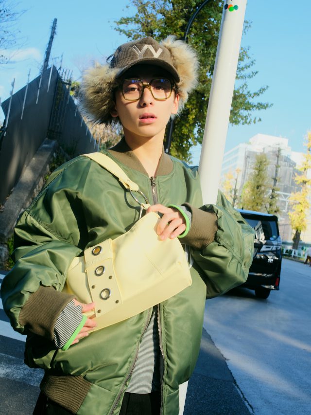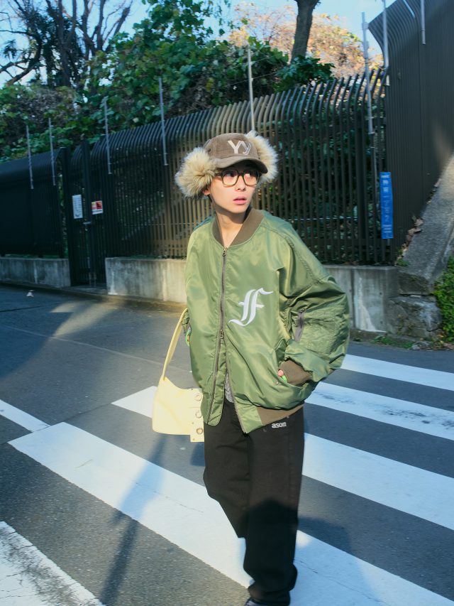 アウター/fa.er.ie.room.311 (フェアリールーム311)、パンツ/as on (アズオン)、キャップ/OPEN YY (オープンワイワイ)、バッグ/Hieta (ヒエタ) *すべて BUYMA (バイマ)、その他本人私物